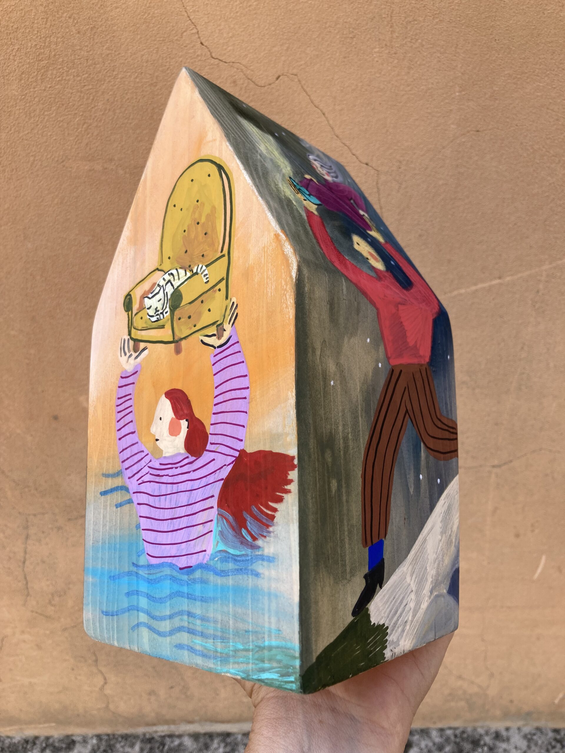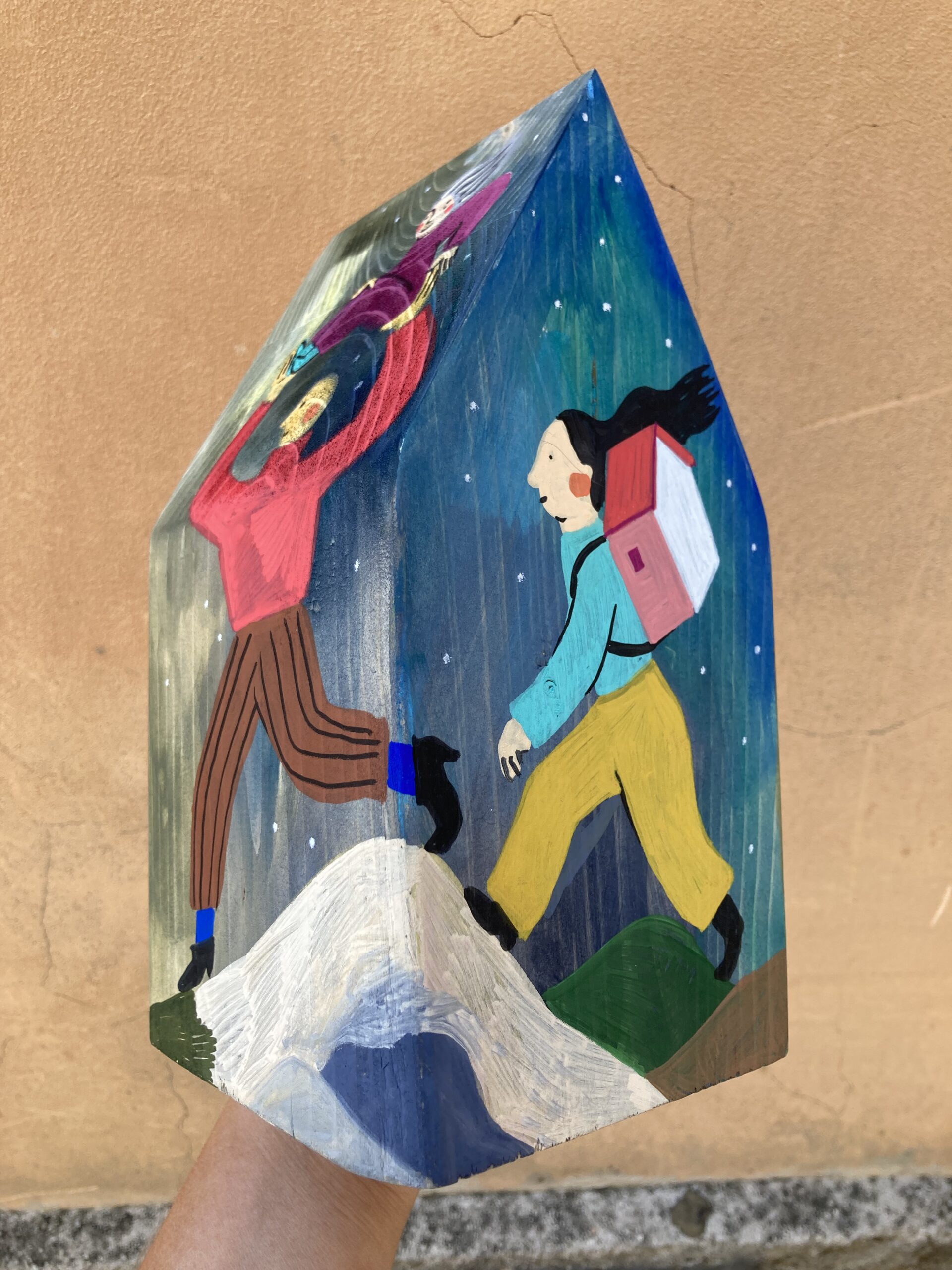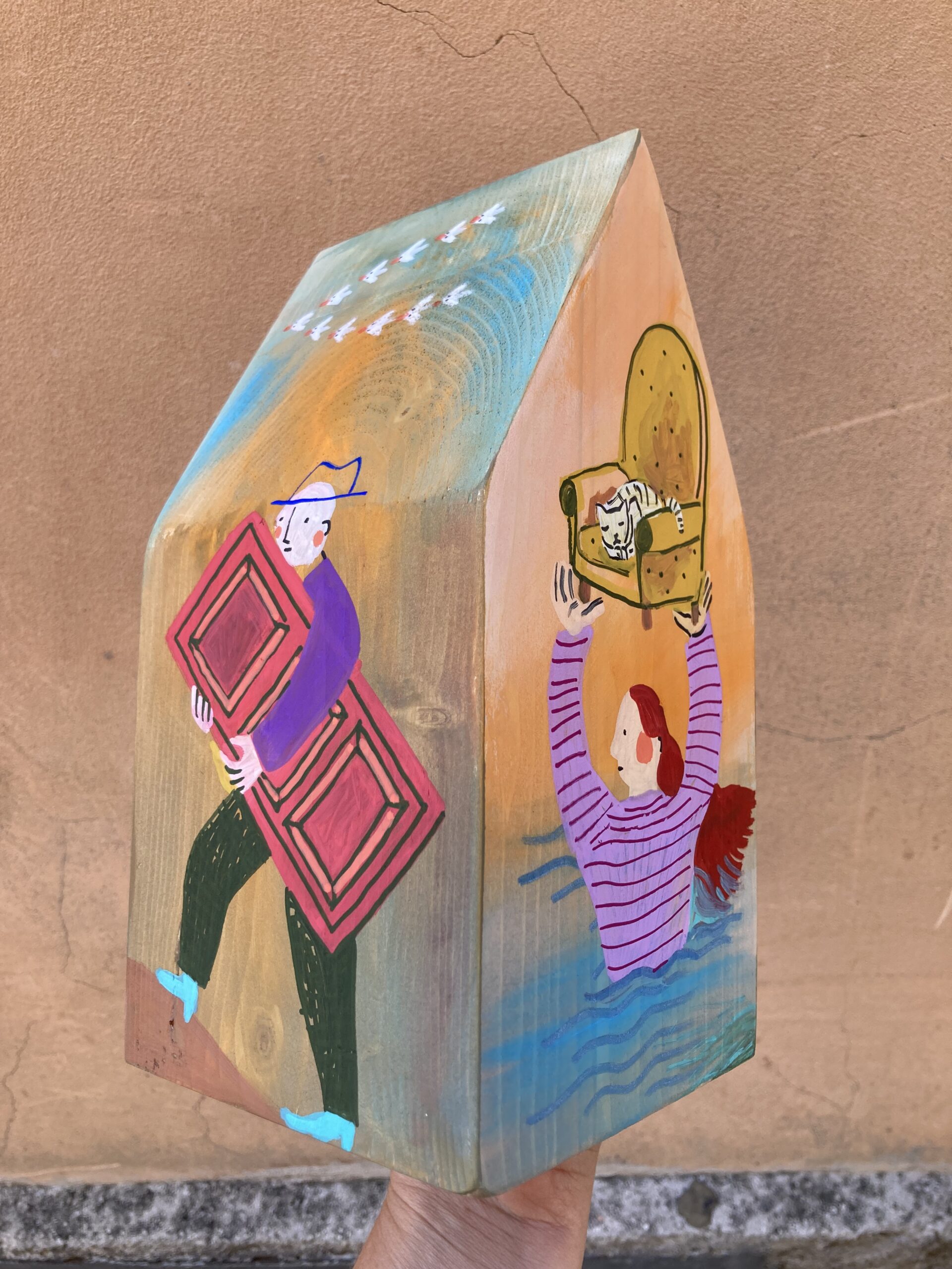Il legno massello è un materiale naturale bellissimo che adoro utilizzare e dipingere: le case di legno mi ricordano quelle dell’infanzia che ci si costruiva da soli come riparo dai mostri con i denti aguzzi. Ognuna e’ ispirata a un tema, un’idea, un colore e una sensazione sempre diversi, quindi le pareti si possono leggere come le pagine di un libro pieno di figure.