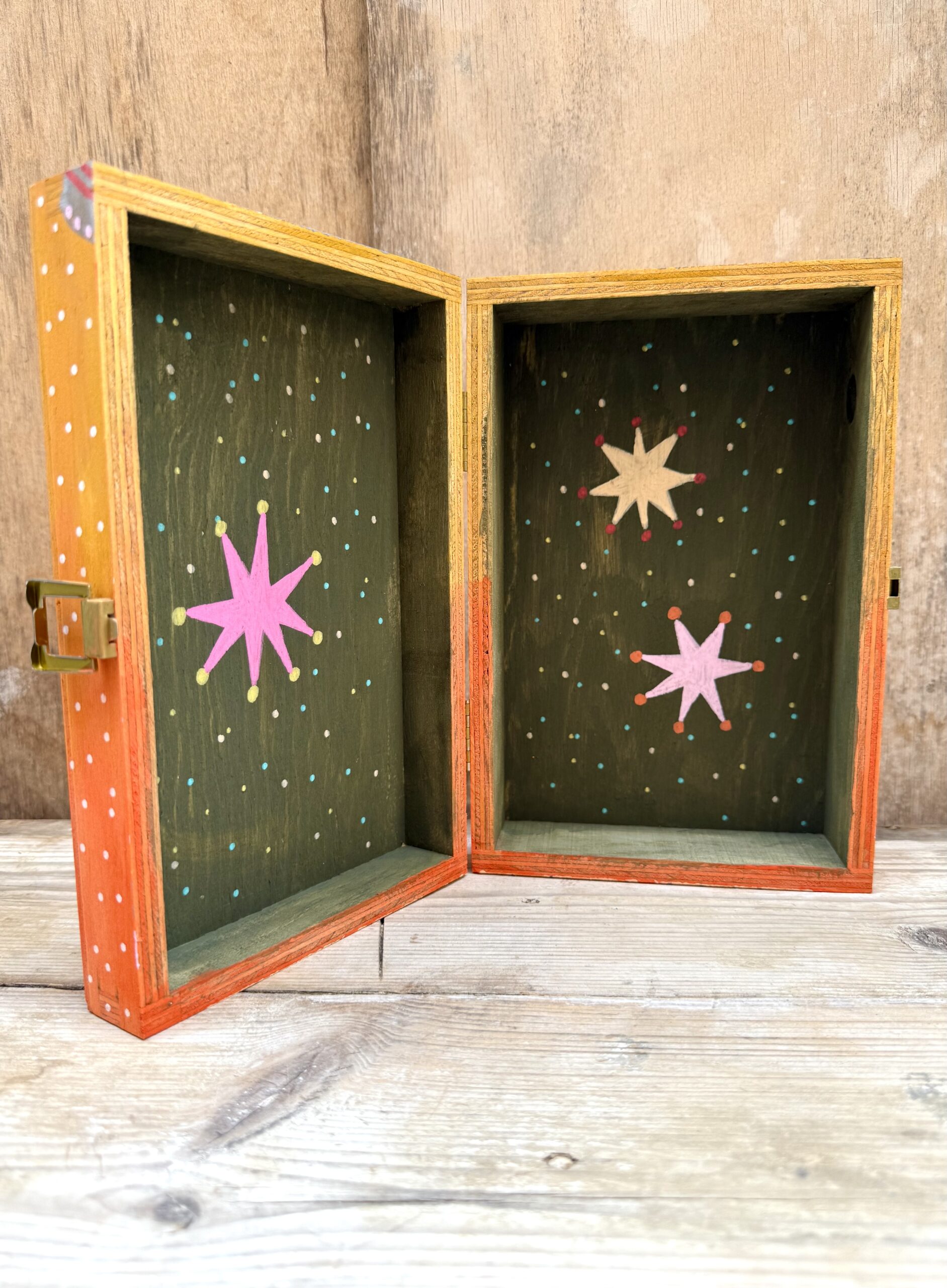 • Le scatole in legno dipinte sono assolutamente originali, dipinte con tecniche miste in un solo unico esemplare. Ho iniziato a dipingere e disegnare tutti i giorni quando ero piccola e non mi sono più fermata! Queste coloratissime scatole non sono fatte in serie e piacciono ad ogni età. Sono originali, uniche e interamente dipinte a mano su legno.Mi aiutano a portare fuori e tradurre tutte le idee e il mondo di colori e personaggi fantastici che abitano la mia testa.